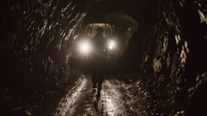 a miner works in a dusty mine with a pickaxe and a jackhammer. mining industry. Coal and ore mining