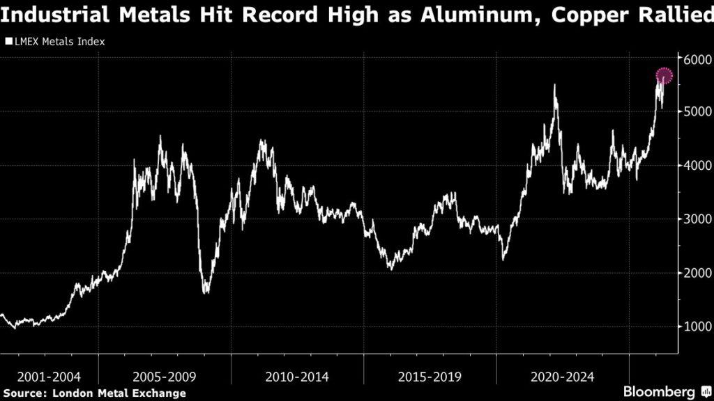 The LME Index, which tracks six major metals, has rallied by almost 12% over the past four weeks and was at an all-time peak at the close of trading. Aluminum has risen more than 15% since the start of the Iran war, with roughly a 10th of global output coming from the Middle East.