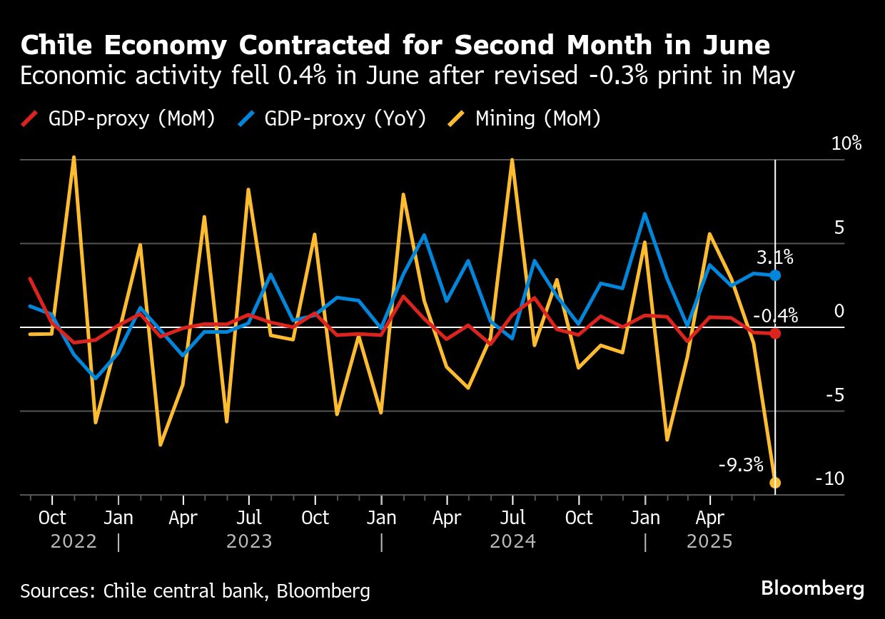 Chile Economy Contracted for Second Month in June | Economic activity fell 0.4% in June after revised -0.3% print in May Jackson Chen | August 1, 2025 | 10:39 am Share Comments Cancel replyYour email address will not be published. Required fields are marked * Save my name, email, and website in this browser for the next time I comment. Δ No comments found. More News Gold price hovers near $5,000 with US and China closed “The market remains in a phase of rebalancing between bulls and bears, lacking clear catalysts to break the range,” analyst says. February 16, 2026 | 09:43 am {{ commodity.name }} {{ post.title }} {{ post.excerpt }} {{ post.date }} First < {{ page }} > Last