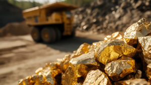 Lode of gold ore mined with an industrial truck in background on sunny day. Gold mining operation. Raw material extraction, economic fortune and financial investment.