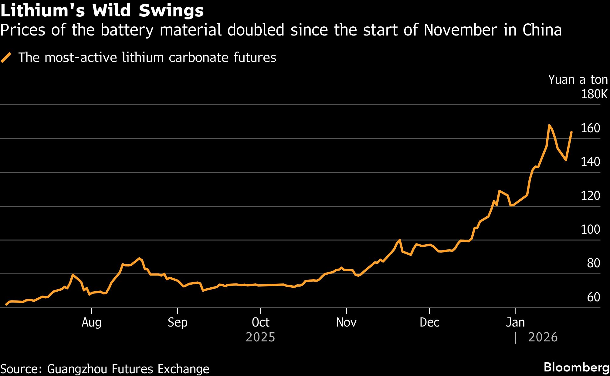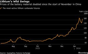 Lithium’s Wild Swings | Prices of the battery material doubled since the start of November in China Jackson Chen | January 21, 2026 | 10:47 am Share Comments Cancel replyYour email address will not be published. Required fields are marked * Save my name, email, and website in this browser for the next time I comment. Δ No comments found. More News Rio Tinto and BHP to lead Australia earnings rebound Both miners enter 2026 set for earnings outperformance, buoyed by commodity prices that help valuations catch up with broader equity markets. February 16, 2026 | 08:49 am {{ commodity.name }} {{ post.title }} {{ post.excerpt }} {{ post.date }} First < {{ page }} > Last