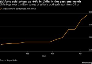 Sulfuric acid prices up 44% in Chile in the past one month | Chile buys over 1 million tonnes of sulfuric acid each year from China Jackson Chen | April 10, 2026 | 10:02 am Share Comments Cancel replyYour email address will not be published. Required fields are marked * Save my name, email, and website in this browser for the next time I comment. Δ No comments found. More News Op-Ed: How gold became national security infrastructure Countries repatriating sovereign gold are not isolated portfolio decisions, David Zaikin writes. April 12, 2026 | 09:48 am US, Australia offer $600M backing for rare earth refinery project The refinery being developed by Tronox Holdings would use existing mining and processing capacity to produce mixed rare earth carbonate. April 12, 2026 | 09:46 am {{ commodity.name }} {{ post.title }} {{ post.excerpt }} {{ post.date }} First < {{ page }} > Last