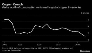 Copper Crunch | Weeks worth of consumption contained in global copper inventories Jackson Chen | October 24, 2022 | 9:13 am Share Comments Cancel replyYour email address will not be published. Required fields are marked * Save my name, email, and website in this browser for the next time I comment. Δ No comments found. More News BHP’s Vicuna unveils $18 billion copper investment in Argentina The project is forecast to average 395,000 tons of copper, 711,000 ounces of gold, and 22.2 million ounces of silver annually over its first 25 years. February 16, 2026 | 01:26 pm {{ commodity.name }} {{ post.title }} {{ post.excerpt }} {{ post.date }} First < {{ page }} > Last