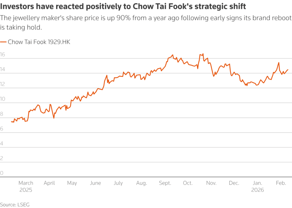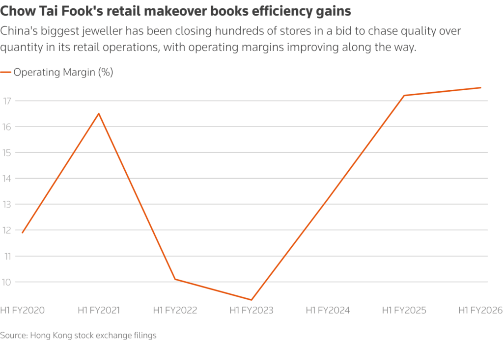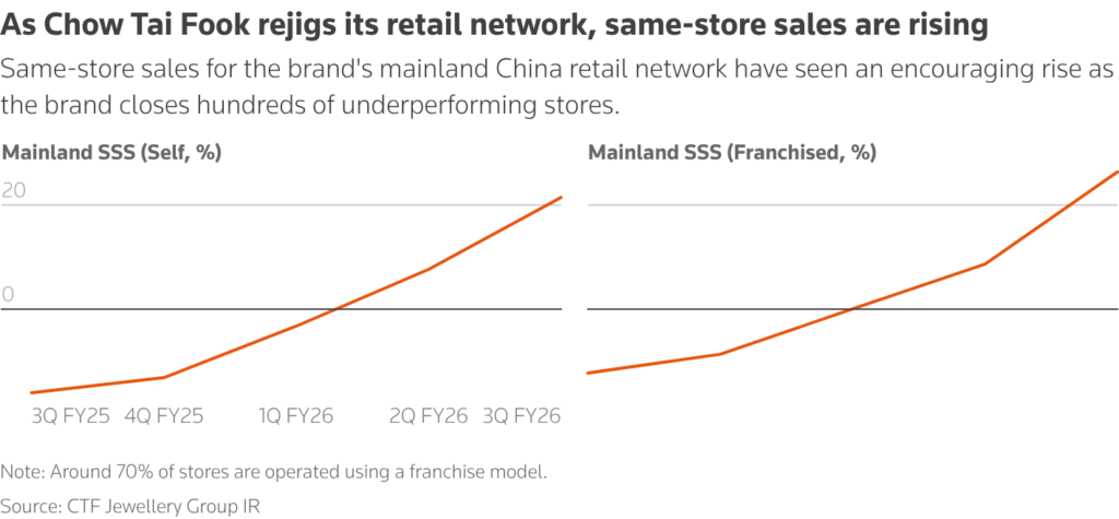 Its effort includes shrinking its massive retail network, upgrading stores, launching new formats and flagship locations, accelerating overseas expansion and shifting more of its portfolio toward higher-margin, fixed-price jewellery.