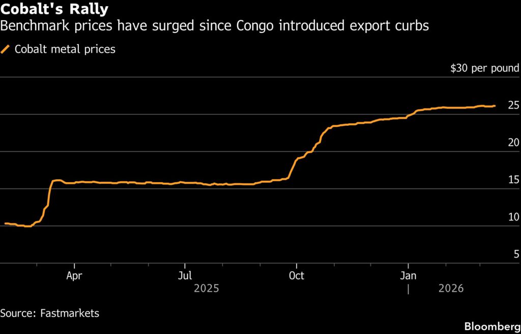 Benchmark prices of the material, which is also used in the aerospace and defense industries, have rallied more than 160% since the restrictions were imposed, according to Fastmarkets Ltd. Cobalt hydroxide – the main product shipped from Congo – has more than quadrupled. That led to a deficit emerging of over 82,000 tons last year, Darton said in a report.