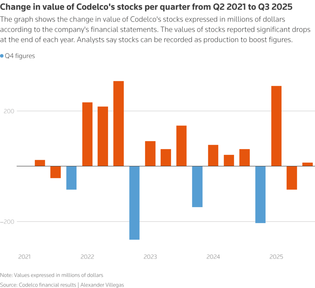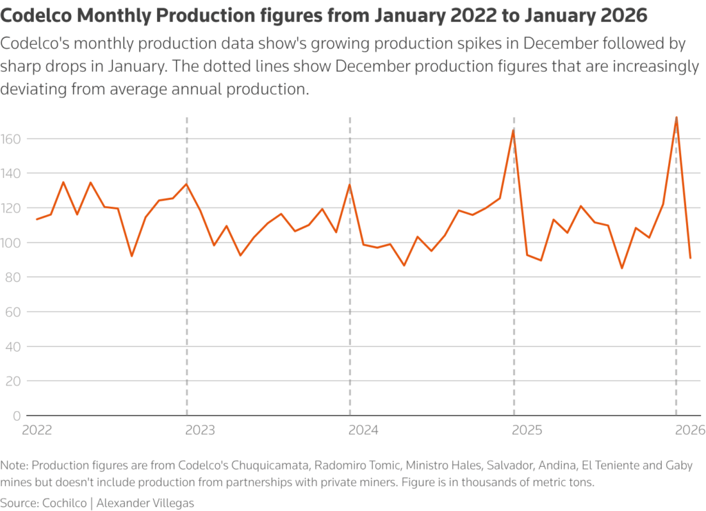 Juan Carlos Guajardo, head of consultancy Plusmining, said use of leach inventories helped lift output toward year-end, noting that Codelco has relied on unusually high inventory use in November and December since 2022.