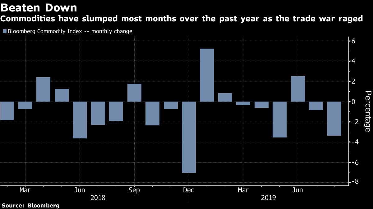 Commodities have slumped most months over the past year as the trade war raged Amanda Stutt | August 23, 2019 | 2:19 pm Share Comments Cancel replyYour email address will not be published. Required fields are marked * Save my name, email, and website in this browser for the next time I comment. Δ No comments found. More News Rio Tinto and BHP to lead Australia earnings rebound Both miners enter 2026 set for earnings outperformance, buoyed by commodity prices that help valuations catch up with broader equity markets. February 16, 2026 | 08:49 am {{ commodity.name }} {{ post.title }} {{ post.excerpt }} {{ post.date }} First < {{ page }} > Last