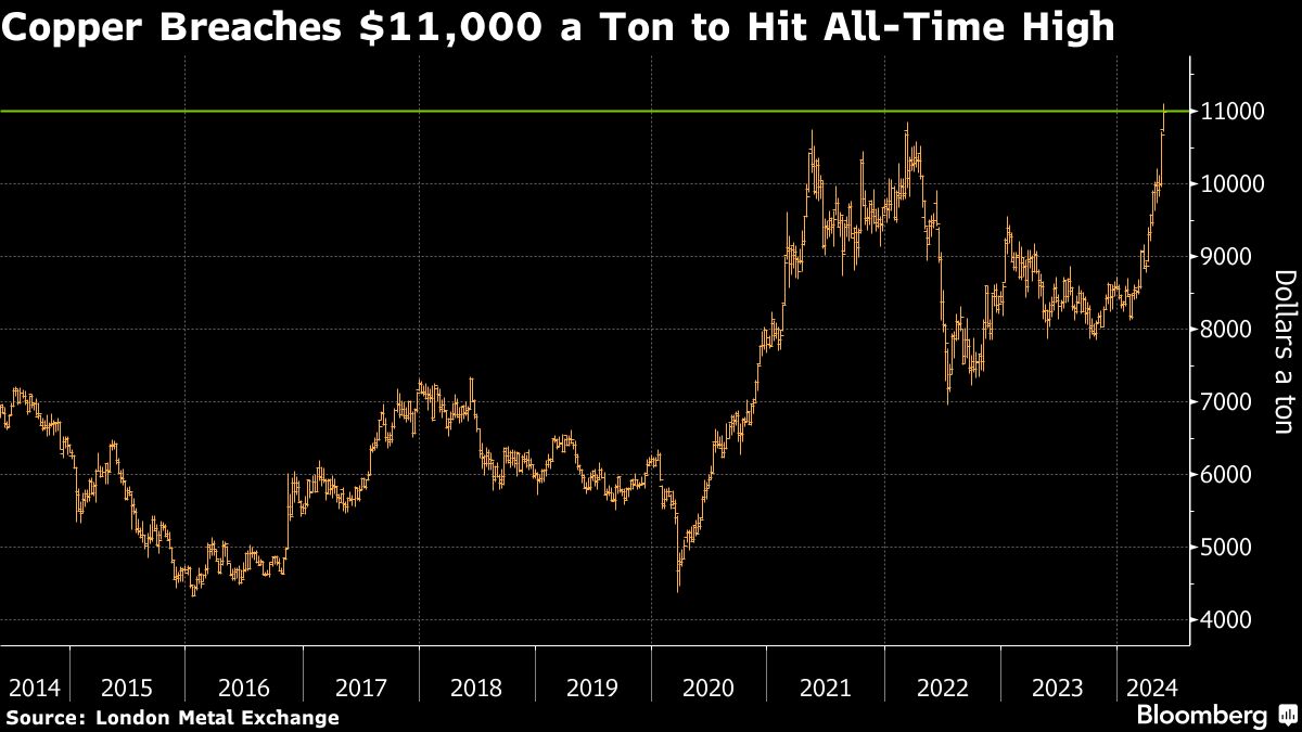 Copper Breaches $11,000 a Ton to Hit All-Time High