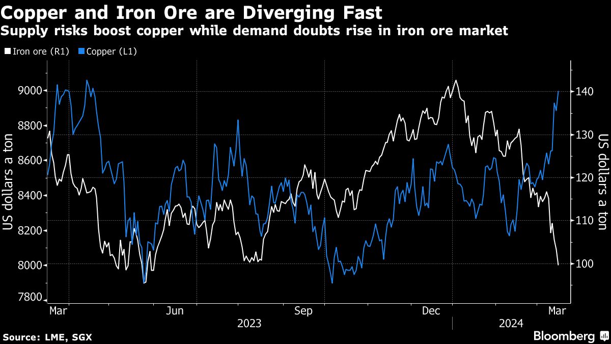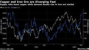 Copper and Iron Ore are Diverging Fast | Supply risks boost copper while demand doubts rise in iron ore market Bruno Venditti | March 15, 2024 | 7:10 am Share Comments Cancel replyYour email address will not be published. Required fields are marked * Save my name, email, and website in this browser for the next time I comment. Δ No comments found. More News African Rainbow Minerals founder steps down from executive role Patrice Motsepe has served as ARM's executive chairman since founding the diversified miner in 2003. February 16, 2026 | 07:46 am {{ commodity.name }} {{ post.title }} {{ post.excerpt }} {{ post.date }} First < {{ page }} > Last