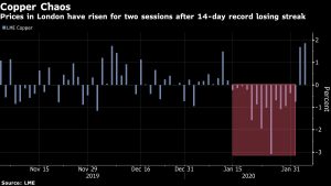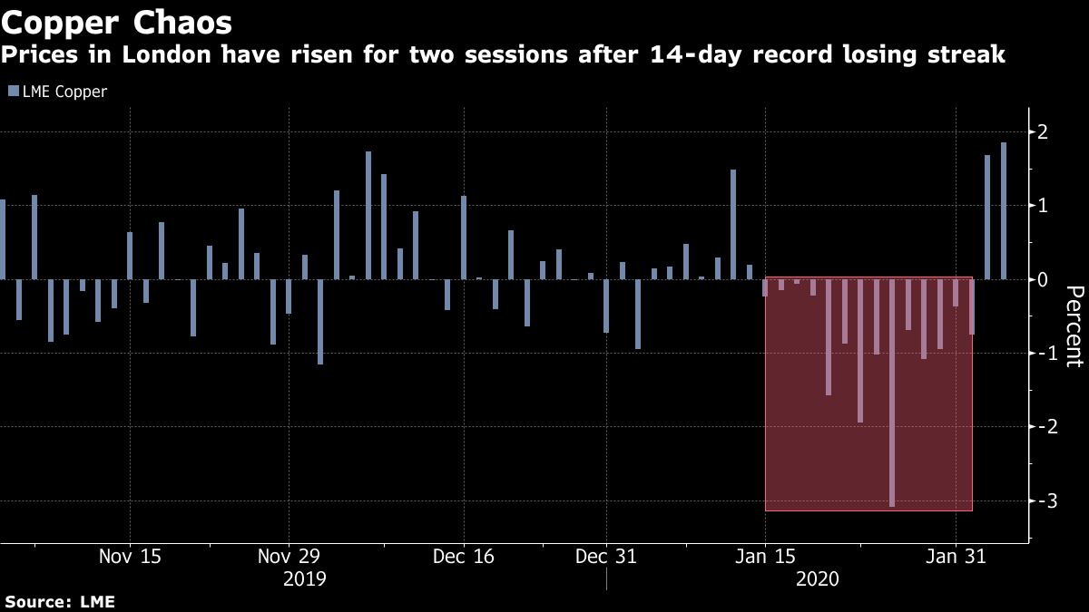 Prices in London have risen for two sessions after 14-day record losing streak Cecilia Jamasmie | February 6, 2020 | 6:28 am Share Comments Cancel replyYour email address will not be published. Required fields are marked * Save my name, email, and website in this browser for the next time I comment. Δ No comments found. More News Copper price: Global exchange stocks top 1 million tonnes first time in 21 years Copper stocks on the world's biggest metal exchanges have exceeded 1 million tons for the first time since 2004. February 16, 2026 | 12:35 pm {{ commodity.name }} {{ post.title }} {{ post.excerpt }} {{ post.date }} First < {{ page }} > Last