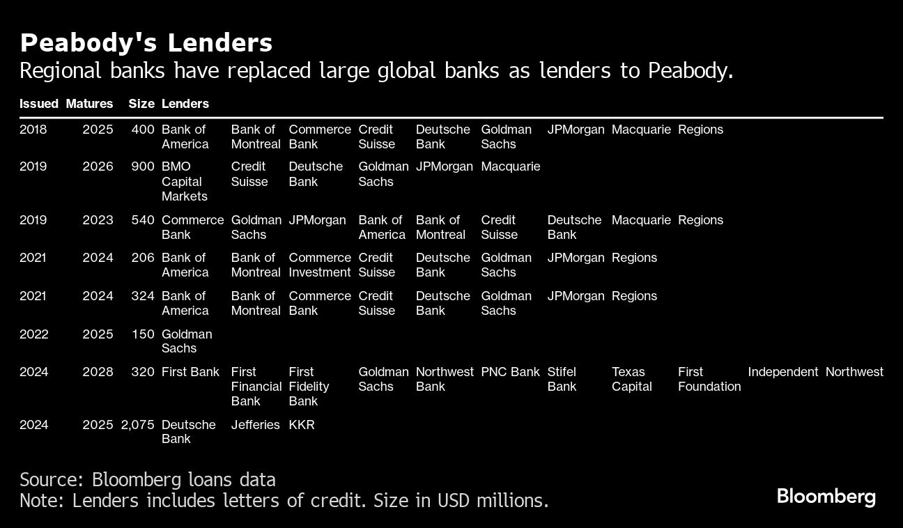 Peabody’s Lenders | Regional banks have replaced large global banks as lenders to Peabody. Jackson Chen | December 2, 2024 | 2:22 pm Share Comments Cancel replyYour email address will not be published. Required fields are marked * Save my name, email, and website in this browser for the next time I comment. Δ No comments found. More News CHART: EV battery metals index jumps to 27-month high EV battery raw materials bill tops $2 billion for the first time since August 2023 and surging lithium, nickel prices going into 2026 puts slump definitively in the rearview mirror. February 16, 2026 | 11:28 am {{ commodity.name }} {{ post.title }} {{ post.excerpt }} {{ post.date }} First < {{ page }} > Last