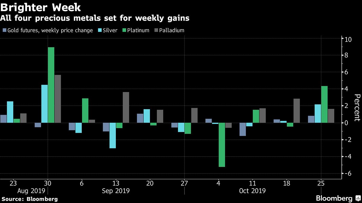 All four precious metals set for weekly gains Amanda Stutt | October 25, 2019 | 12:33 pm Share Comments Cancel replyYour email address will not be published. Required fields are marked * Save my name, email, and website in this browser for the next time I comment. Δ No comments found. More News Gold price hovers near $5,000 with US and China closed “The market remains in a phase of rebalancing between bulls and bears, lacking clear catalysts to break the range,” analyst says. February 16, 2026 | 09:43 am {{ commodity.name }} {{ post.title }} {{ post.excerpt }} {{ post.date }} First < {{ page }} > Last