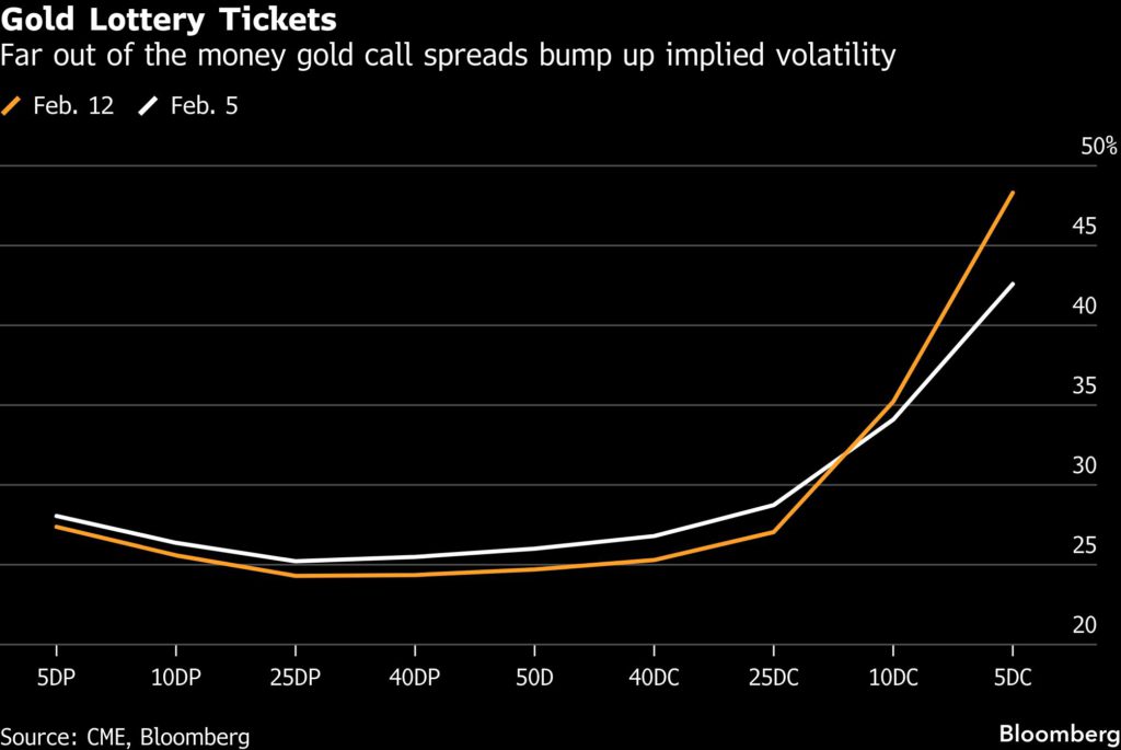 Gold’s call skew — or the premium for bets on a price gain versus a decline — is getting cheaper across different expiration months so far in February, but realized price volatility remains high, Doshi said, adding that the market still has the potential for large “gap” moves.
