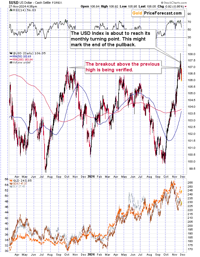 So, yes, the pullback is taking place, which means that the monthly turning point can play out exactly as I had described it earlier – it could push the USDX higher once again. This would likely contribute to declines in the values of precious metals and mining stocks.