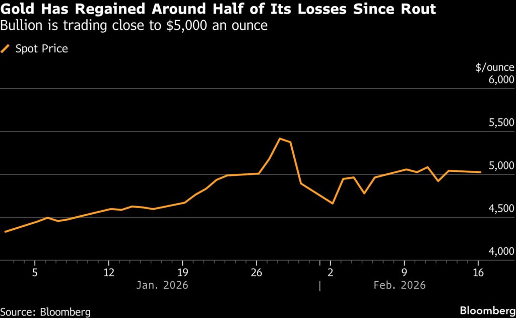 Gold fell 0.9%, holding near $5,000 an ounce. Bullion gained 2.4% Friday after a modest rise in the US consumer price index for January allayed concerns about a bigger jump. That boosted the case for the Federal Reserve to trim interest rates — a tailwind for precious metals, which don’t pay interest.