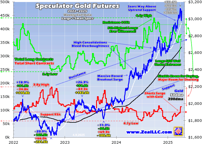 With big tariffs bursting the AI stock bubble, gold’s epic monster upleg ought to continue powering higher on balance. Big central-bank buying has led the way, which will likely accelerate as this global trade war retards demand for US dollars. And American stock investors have barely started chasing gold, speculators’ gold-futures positioning isn’t extreme, and gold’s recent pullback just reversed much overboughtness.