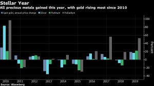All precious metals gained this year, with gold rising most since 2010 Jackson Chen | December 31, 2019 | 10:03 am Share Comments Cancel replyYour email address will not be published. Required fields are marked * Save my name, email, and website in this browser for the next time I comment. Δ No comments found. More News Copper price: Global exchange stocks top 1 million tonnes first time in 21 years Copper stocks on the world's biggest metal exchanges have exceeded 1 million tons for the first time since 2004. February 16, 2026 | 12:35 pm {{ commodity.name }} {{ post.title }} {{ post.excerpt }} {{ post.date }} First < {{ page }} > Last