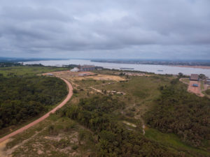 Aerial drone view of agriculture silos for storing soybeans and Tapajos river, Itaituba, Para, Brazil. Concept of environment, nature, ecology, climate change, deforestation, climate change, industry.