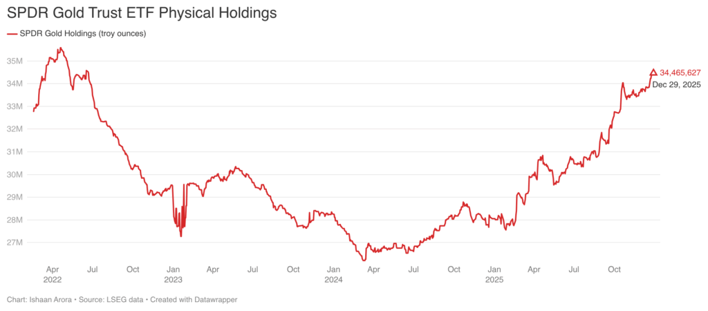 Holdings of the largest gold-backed ETFs including New York’s SPDR Gold Trust reached 1,073.41 metric tons on December 29, their highest in more than three years.