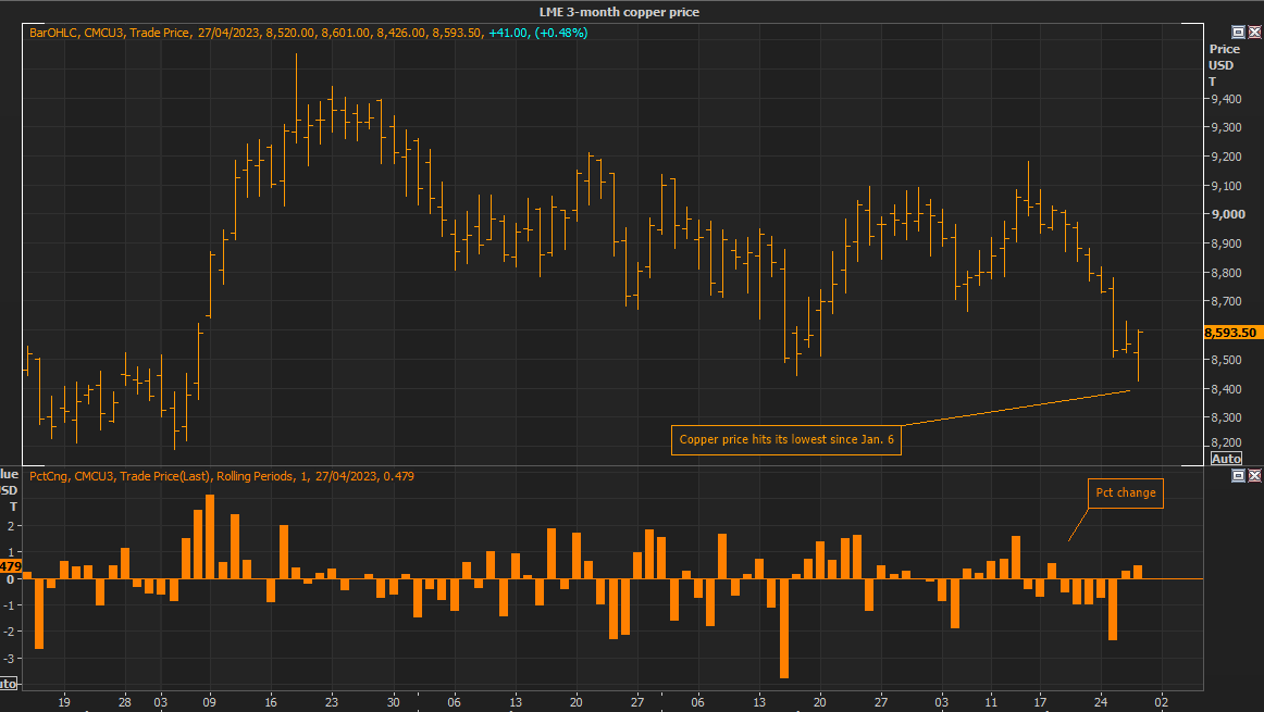 LME-3-month-copper-price-April-27 Jackson Chen | April 28, 2023 | 9:48 am Share Comments Cancel replyYour email address will not be published. Required fields are marked * Save my name, email, and website in this browser for the next time I comment. Δ No comments found. More News Mexico and Canada plan joint action on minerals The countries will present an joint action plan on minerals, infrastructure and supply chains in the second half of the year. February 16, 2026 | 09:46 am {{ commodity.name }} {{ post.title }} {{ post.excerpt }} {{ post.date }} First < {{ page }} > Last