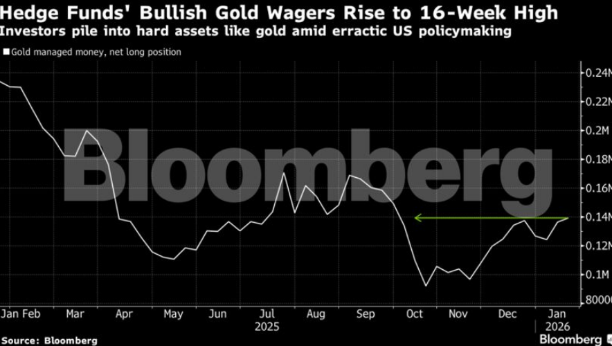 Money managers increased their bullish wagers on gold to the highest since October as anxieties over Greenland prompted investors to rotate into hard assets away from currencies and sovereign bonds.