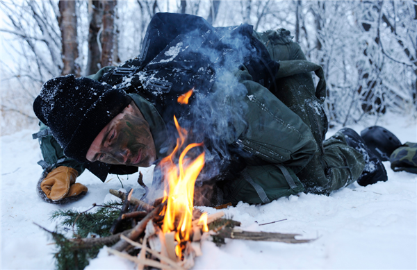 Surviving, outdoors, starting fire on the mountain, winter scene, warmth