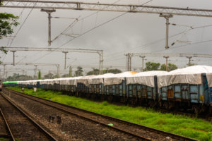 View of a passenger train engine of Indian railways in transit and urban and rural areas in India