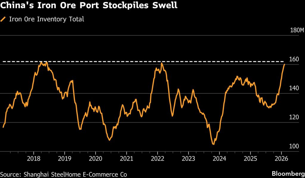 Port stockpiles in China rose for a 10th week, adding 0.6% to 160 million tons, according to data from a sample of ports by Shanghai SteelHome E-Commerce Co. on Friday. That’s the highest since 2022, and near the record set in 2018. The rising holdings may also reflect the impact of a pricing dispute between miner BHP Group and state buyer China Mineral Resources Group Co.