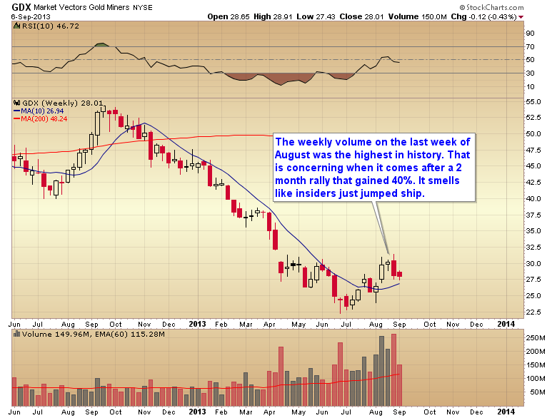 Looking at the weekly chart only confirms my suspicion. The last week of August was the highest volume week in GDX’s history. When that kind of volume appears at the top of a two-month rally, after a 40% gain, there’s a good chance its signaling smart money just snuck out the back door. We should only see this kind of volume at the bottom of a serious decline, not the top of a two-month rally unless something is wrong.
