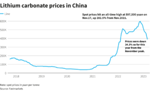 China-lithium-prices Jackson Chen | February 28, 2023 | 5:34 pm Share Comments Cancel replyYour email address will not be published. Required fields are marked * Save my name, email, and website in this browser for the next time I comment. Δ No comments found. More News Iran says potential energy, mining deals on table in talks with US Iran has threatened to strike US bases in the Middle East if it is attacked by US forces but on Sunday took a conciliatory line. February 15, 2026 | 09:34 am {{ commodity.name }} {{ post.title }} {{ post.excerpt }} {{ post.date }} First < {{ page }} > Last