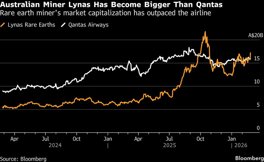 Lynas Rare Earths Ltd. has overtaken Australian blue-chip stalwart Qantas Airways Ltd. by market capitalization, as concerns about China’s dominance of critical minerals lift the miner’s stock.