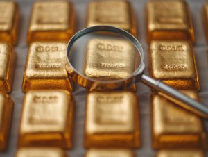 Magnifying glass inspecting gold bars: wealth management and investment security