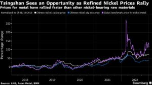 Tsingshan Sees an Opportunity as Refined Nickel Prices Rally | Prices for metal have rallied faster than other nickel-bearing raw materials Jackson Chen | January 9, 2023 | 10:09 am Share Comments Cancel replyYour email address will not be published. Required fields are marked * Save my name, email, and website in this browser for the next time I comment. Δ No comments found. More News CHART: EV battery metals index jumps to 27-month high EV battery raw materials bill tops $2 billion for the first time since August 2023 and surging lithium, nickel prices going into 2026 puts slump definitively in the rearview mirror. February 16, 2026 | 11:28 am {{ commodity.name }} {{ post.title }} {{ post.excerpt }} {{ post.date }} First < {{ page }} > Last