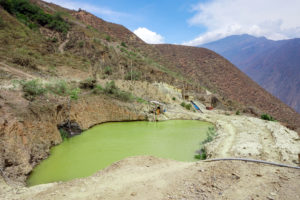 Toxic waste water pond from gold mining operation in the mountains of Peru, highlighting environmental impact in a remote Andean landscape.