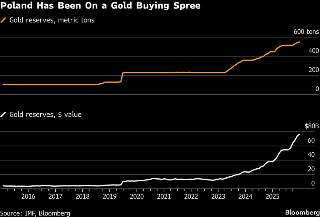 Governor Adam Glapinski has spearheaded efforts to raise the ceiling for gold holdings, which amounted to 550 tons at the end of 2025. Until now, the bank could allocate as much as 30% of its overall reserves to bullion, and soaring prices have pushed the metal to about 28%.