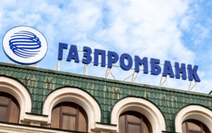 Signboard with the logo of the Gazprombank against the blue sky. Text in russian: Gazprombank