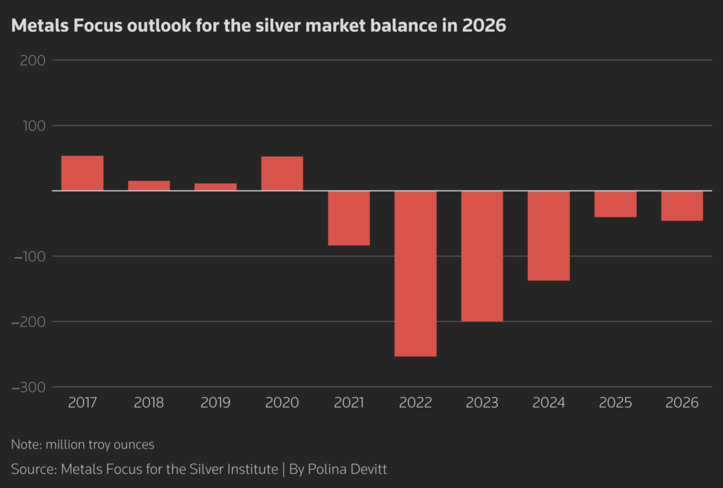 The silver market is heading for a sixth year of structural deficit, with 762 million troy ounces drawn from stocks since 2021, raising the risk of a renewed liquidity squeeze despite weaker demand expectations, the Silver Institute and consultancy Metals Focus said on Wednesday.
