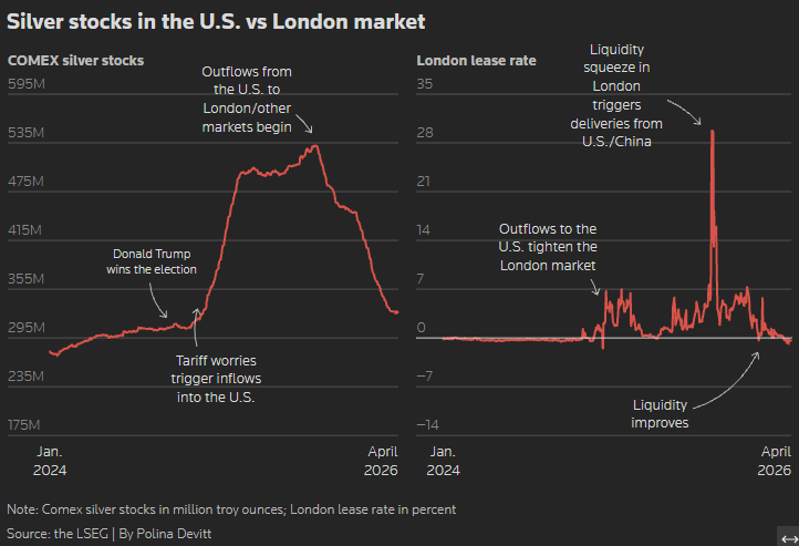 Metals Focus estimates that 28% of 884 million ounces of silver held in London vaults at end-March were not tied to ETPs and were potentially available to support liquidity, the highest share since January 2025 and up from a historic low of 17% in September that helped precipitate the October squeeze.