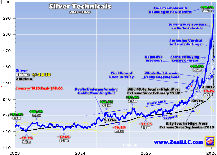 Silver’s daily gains in these last few weeks have been crazy, including massive up days of 9.2%, 5.6%, 5.5%, 6.3%, 6.4%, and 6.9%! In the 31 trading days since December dawned, silver has surged or soared to new all-time-record highs on fully 16 of them! And silver’s overboughtness is far-beyond-extreme, unlike anything seen in most investors’ lifetimes. That prompted me to write this essay, which I will be attacked for.