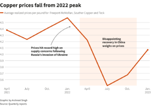 reuters-copper-prices-fall-from-2022-peak Cecilia Jamasmie | July 25, 2023 | 6:21 am Share Comments Cancel replyYour email address will not be published. Required fields are marked * Save my name, email, and website in this browser for the next time I comment. Δ No comments found. More News Rio Tinto and BHP to lead Australia earnings rebound Both miners enter 2026 set for earnings outperformance, buoyed by commodity prices that help valuations catch up with broader equity markets. February 16, 2026 | 08:49 am {{ commodity.name }} {{ post.title }} {{ post.excerpt }} {{ post.date }} First < {{ page }} > Last