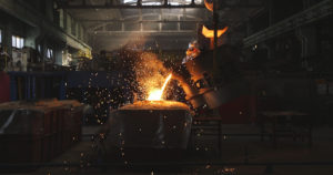 The molten metal is poured into the mold. Melting furnace for cast iron and steel and liquid metal.