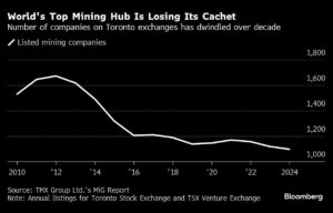 World’s Top Mining Hub Is Losing Its Cachet | Number of companies on Toronto exchanges has dwindled over decade Bruno Venditti | March 3, 2025 | 6:57 am Share Comments Cancel replyYour email address will not be published. Required fields are marked * Save my name, email, and website in this browser for the next time I comment. Δ No comments found. More News CHART: EV battery metals index jumps to 27-month high EV battery raw materials bill tops $2 billion for the first time since August 2023 and surging lithium, nickel prices going into 2026 puts slump definitively in the rearview mirror. February 16, 2026 | 11:28 am {{ commodity.name }} {{ post.title }} {{ post.excerpt }} {{ post.date }} First < {{ page }} > Last