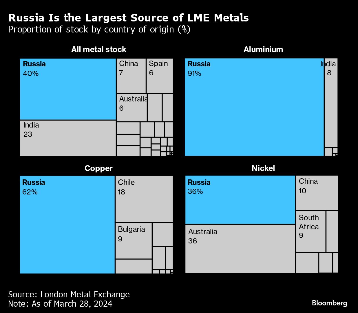 Russia Is the Largest Source of LME Metals | Proportion of stock by country of origin (%) Jackson Chen | April 17, 2024 | 6:03 am Share Comments Cancel replyYour email address will not be published. Required fields are marked * Save my name, email, and website in this browser for the next time I comment. Δ No comments found. More News BHP’s Vicuna unveils $18 billion copper investment in Argentina The project is forecast to average 395,000 tons of copper, 711,000 ounces of gold, and 22.2 million ounces of silver annually over its first 25 years. February 16, 2026 | 01:26 pm {{ commodity.name }} {{ post.title }} {{ post.excerpt }} {{ post.date }} First < {{ page }} > Last