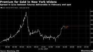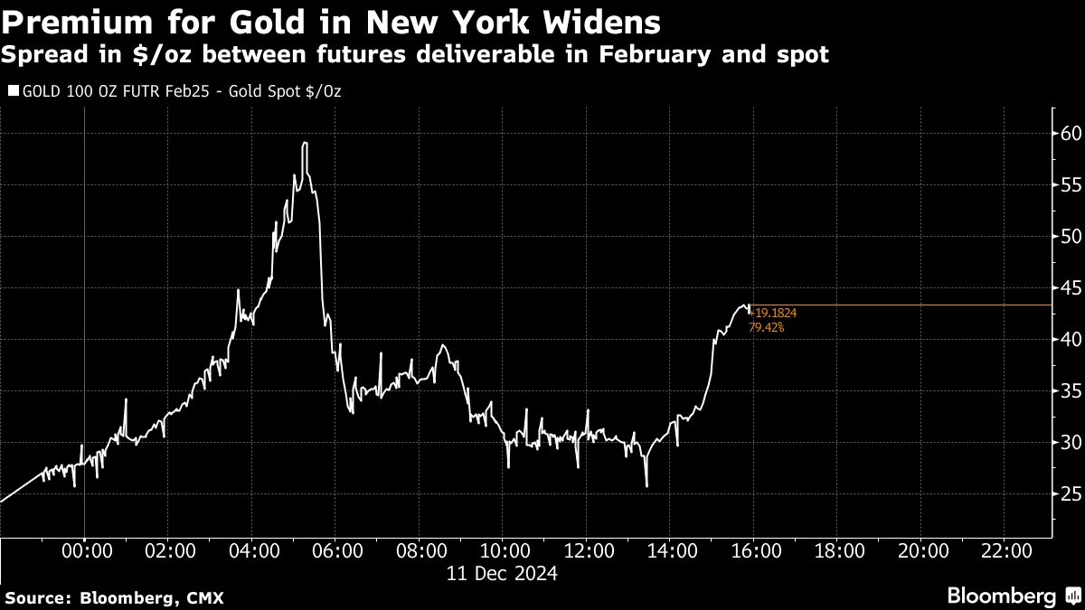 Premium for Gold in New York Widens | Spread in $/oz between futures deliverable in February and spot Jackson Chen | December 11, 2024 | 8:39 am Share Comments Cancel replyYour email address will not be published. Required fields are marked * Save my name, email, and website in this browser for the next time I comment. Δ No comments found. More News BHP’s Vicuna unveils $18 billion copper investment in Argentina The project is forecast to average 395,000 tons of copper, 711,000 ounces of gold, and 22.2 million ounces of silver annually over its first 25 years. February 16, 2026 | 01:26 pm {{ commodity.name }} {{ post.title }} {{ post.excerpt }} {{ post.date }} First < {{ page }} > Last