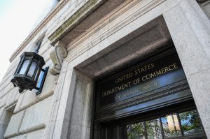 Front of the Herbert Hoover U.S. Department of Commerce building in Washington, D.C.,