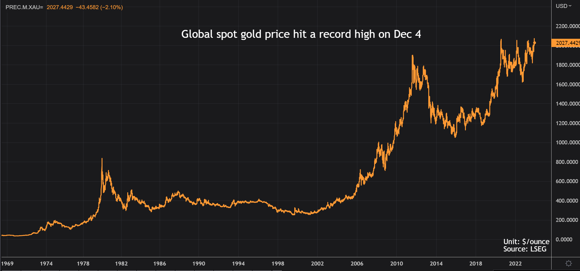 Global-spot-prices-all-time-high-on-Monday Jackson Chen | December 5, 2023 | 3:14 pm Share Comments Cancel replyYour email address will not be published. Required fields are marked * Save my name, email, and website in this browser for the next time I comment. Δ No comments found. More News Aluminum and copper prices take breather after explosive start to 2026 Industrial metals have enjoyed a bullish run into the new year. January 13, 2026 | 03:12 pm {{ commodity.name }} {{ post.title }} {{ post.excerpt }} {{ post.date }} First < {{ page }} > Last